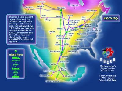 La Coalición para el Supercorredor de Norte América (NASCO) se ha estado gestando durante más de 13 años y sus dirigentes han estado trabajando durante todos estos años para crear super-autopistas que conectarán Canadá, Méjico y Estados Unidos para convertir a esa comunidad de países en algo similar a la Unión Europea, sin fronteras, con una legislación y normativa común así como una moneda que aparentemente se va a a llamar AMERO.